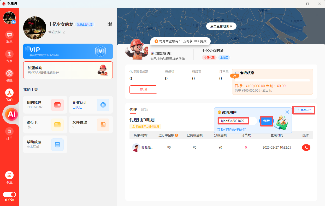 支付的每笔项目订单,区域代理将获得该交易佣金的10%【】作为收益。 有效收益为用户实际支付且结算的订单金额,全款退单或未结算的订单不计入收益。- 绑定用户的订单支付后,收益将在