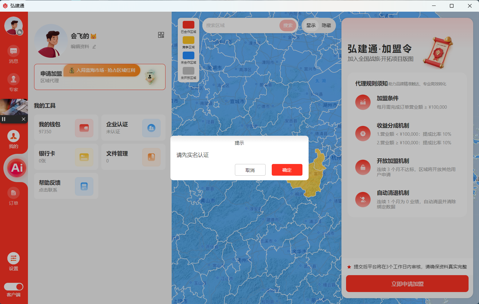 区域代理仅允许个体户及企业申请,申请区域代理需要先完成实名认证。建议同时也完成企业认证,提升申请通过率。
