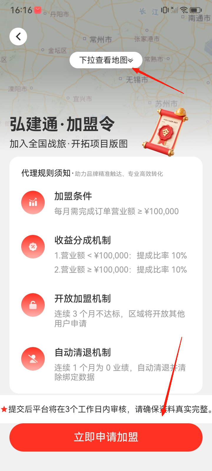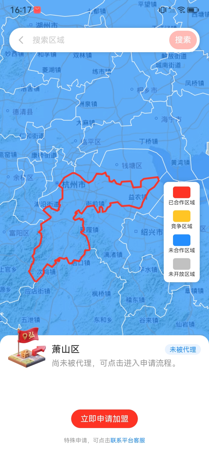 区域代理页面,点击“申请加盟”按钮,进入申请页面。 - 在申请页面,填写相关信息,包括但不限于:
