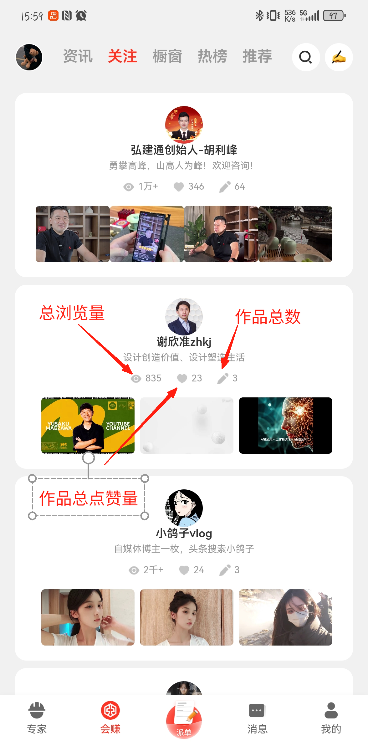 关注页面提供已关注的所有用户主页卡片,每个卡片最多只显示四个视频,视频上方依次为所有作品总浏览量、总点赞量、总作品数。点击卡片可进入对应用户的主页。
