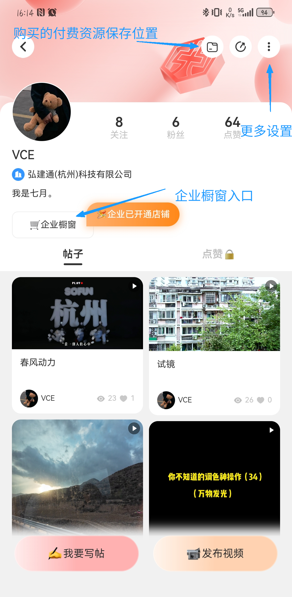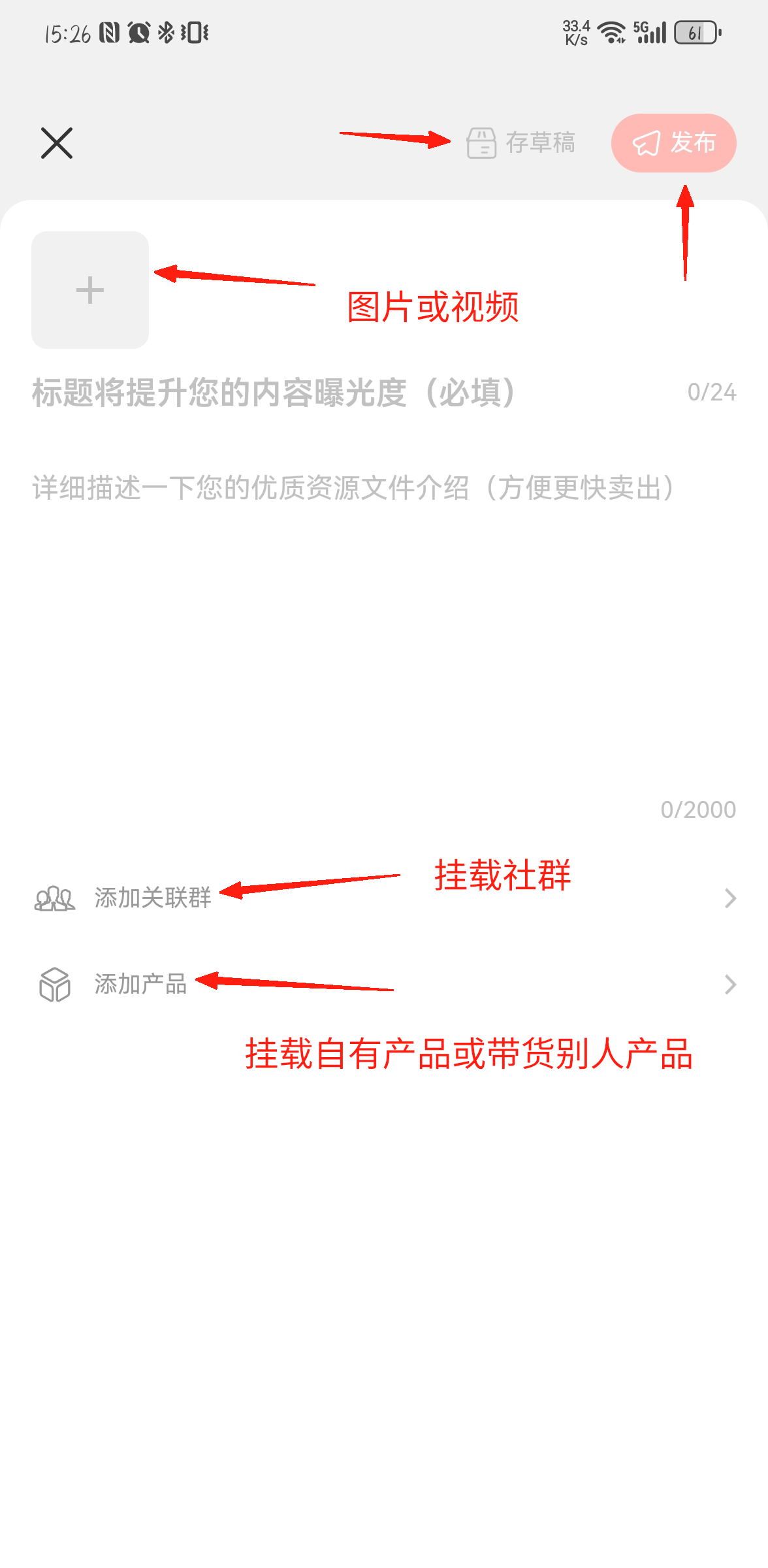 发布视频位于会赚社区右上角图标,在弹出菜单中可选择我要写帖或者发布视频,两者均可以挂载带货链接和社群,以及付费资源。编辑器存在内容时,草稿箱自动生效,退出页面会存入云端草稿箱,支持多端同步。