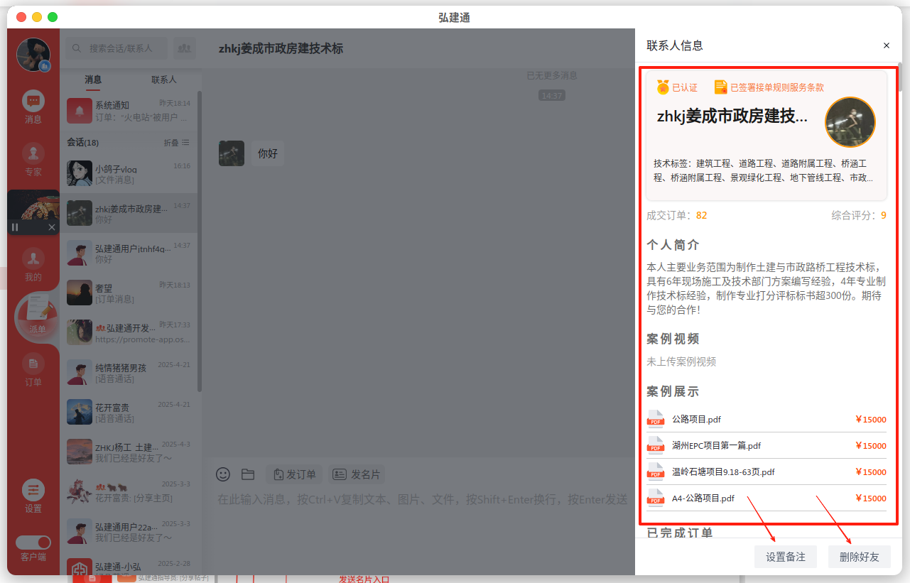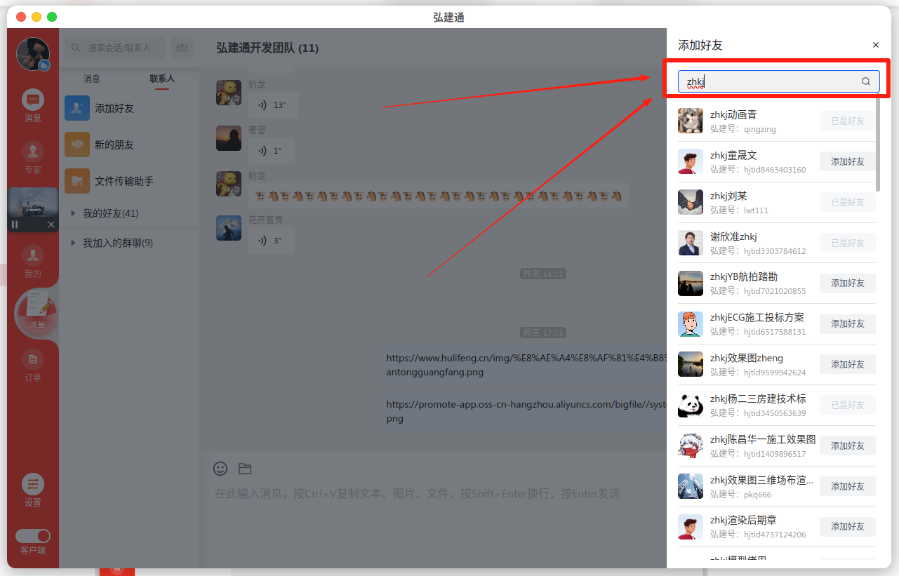 添加好友,可搜索非好友用户,添加为好友。【支持弘建通号、昵称搜索】 - 下方为