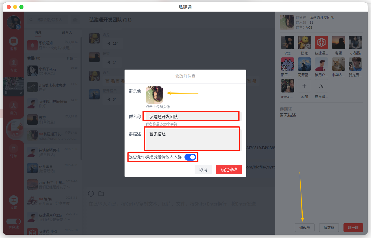 消息列表中带 图标的条目为群聊消息,全部群聊的管理入口位于通讯录界面我的好友分组下方。支持修改头像,群聊名称,描述,以及设置是否允许其他人邀请进群。修改后需要手动点击确认修改保存。