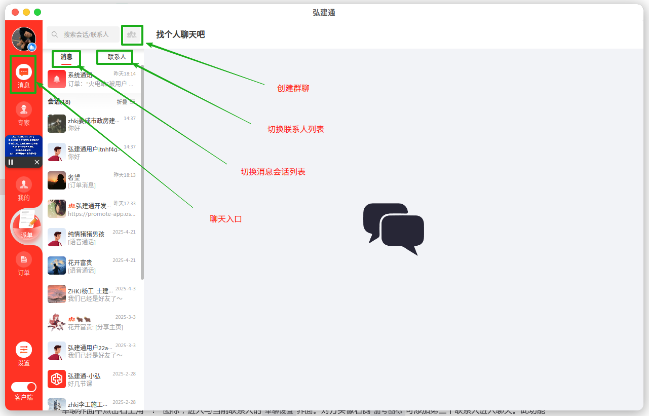 本页面包含聊天功能的说明,如有需要点击对应标题即刻跳转到对应的操作说明。以电脑端界面进行演示,包括windows7、windows10、Mac。