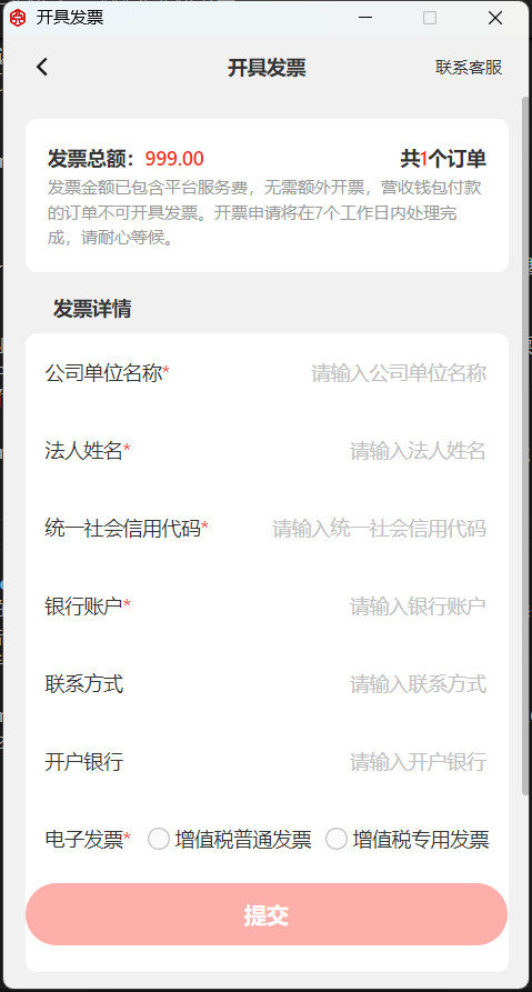 3.开票申请仅可申请实付金额大于零元的订单,且仅支持开具一次发票。