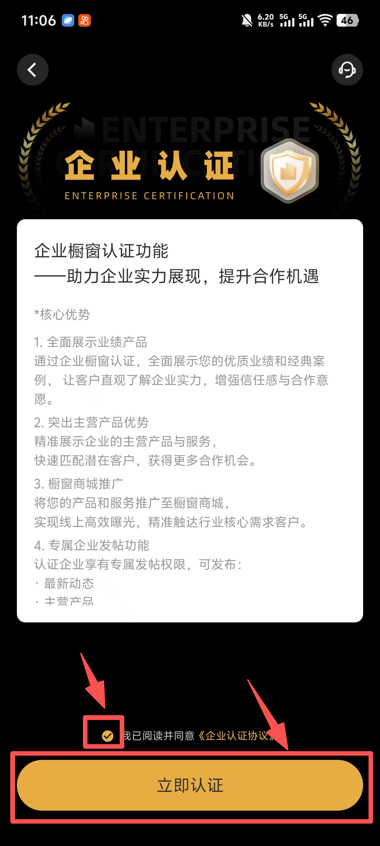 - 企业认证:开通后可享受企业认证服务,认证后可上架企业资质和产品进行推广。