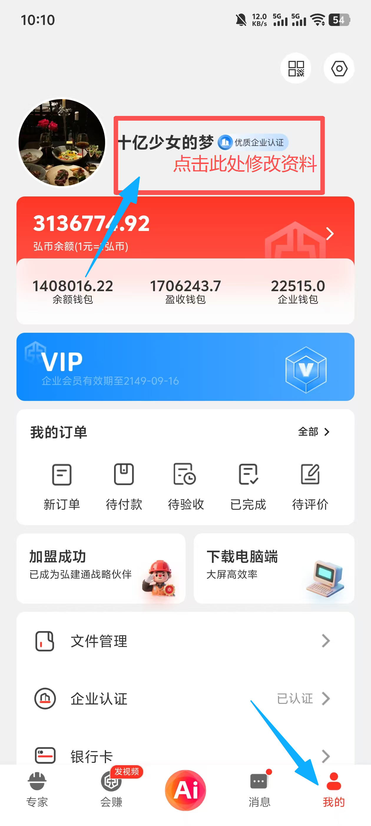 在修改个人资料界面中,标记区域是实名认证,实名认证和企业认证非强关联,可全部认证也可以选择其一进行认证。但需注意,使用营收钱包提现时会校验是否进行了实名认证,未进行实名认证的账户不管是个人还是企业均无法提现。