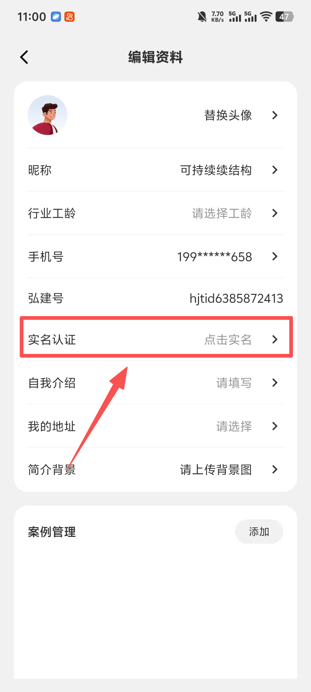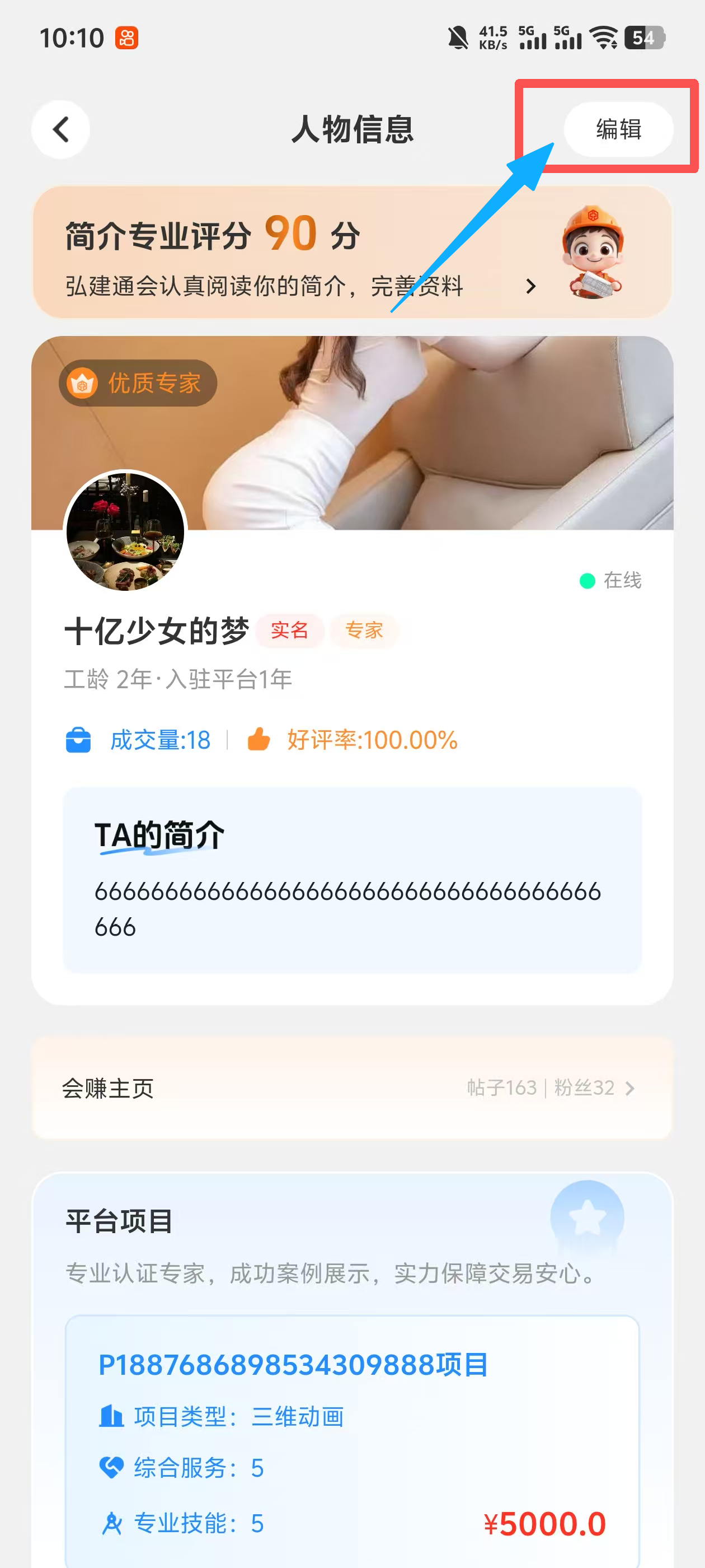 点击下方图1中标记区域可进入人物信息页面界面,点击编辑按钮进入编辑资料界面。支持修改字段:用户昵称、地址、自我介绍、头像、手机号、行业工龄、简介背景、上传案例。以下将对各字段填写及修改要求做明确说明: