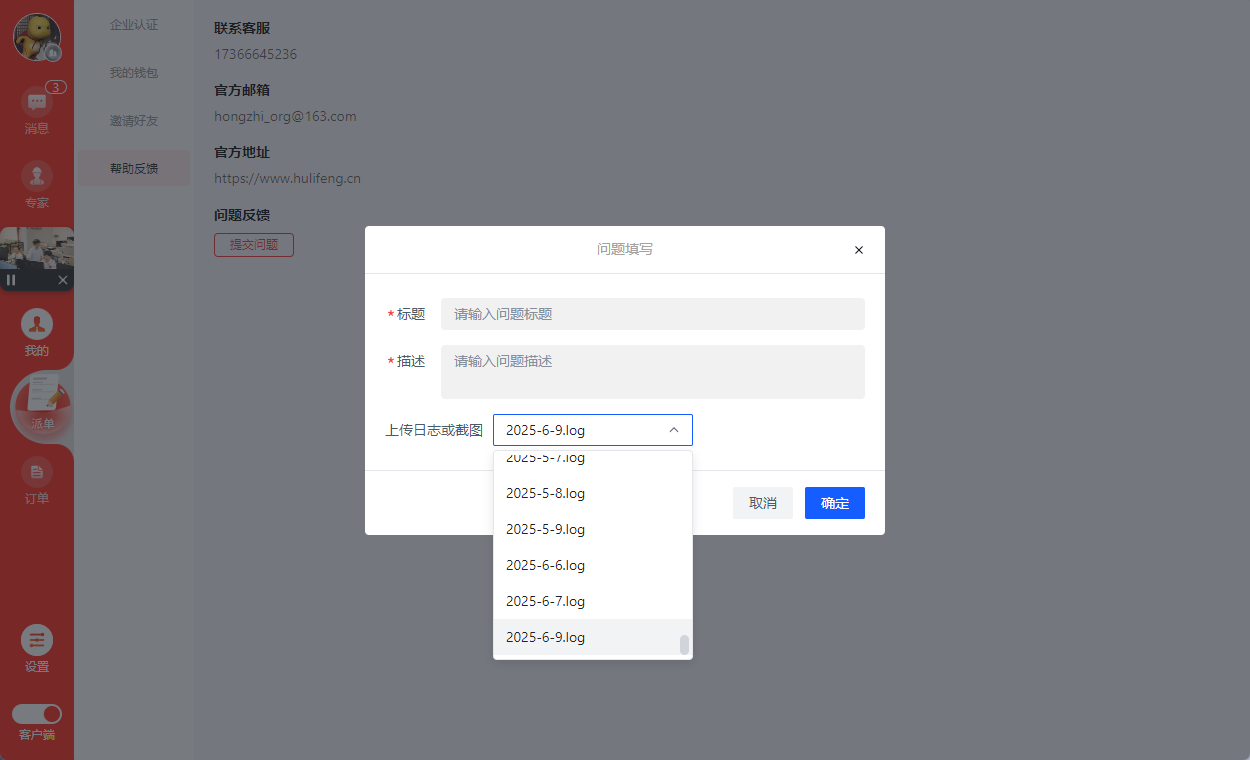 在任意界面点击我的进入二级界面,选择最后一项帮助反馈后,点击问题反馈,选择对应要上传的日志,填写问题描述和问题标题。